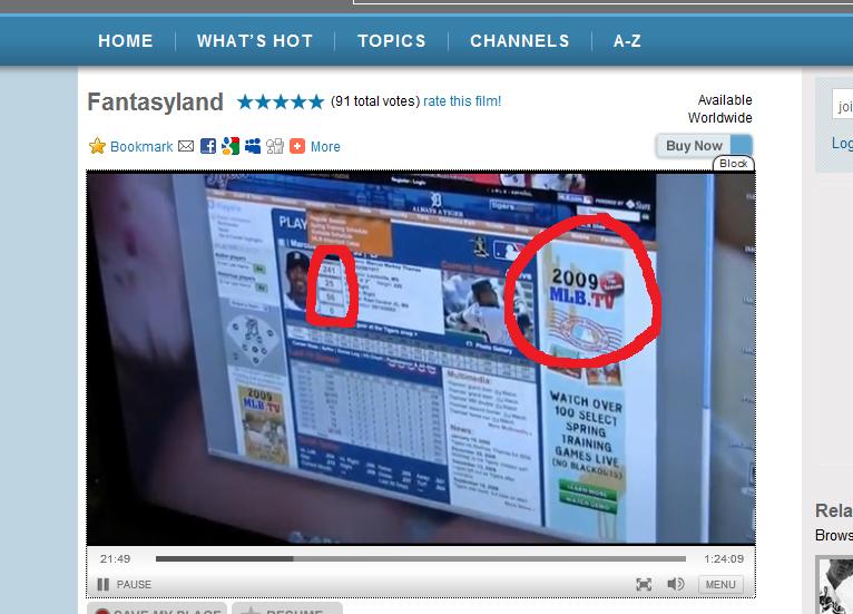 Notice two things. First, there is an advertisement for 2009 MLB.TV on the MLB.com website. Why would MLB.TV be advertising for the 2009 season before the 2008 season has even begun? Secondly, Marcus Thames’ actual 2008 stats are listed on his player page: .241 BA, 25 HR, 56 RBI. Additionally, at an earlier point from this scene, Latkins is looking over a stat sheet for Justin Verlander which lists Verlander’s actual 2008 statistics. I understand that movies are filmed anachronistically for editing and logistical purposes, but the purely outlandish nature of some scenes and these continuity errors make me question the reality of certain scenes such as when Latkins spontaneously shows up to Ron Shandler’s house to try and make a trade.